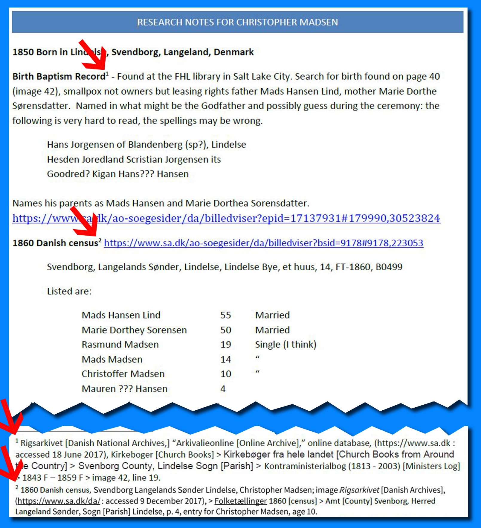 Additionally, by using footnotes, your research notes, it’s easier to read your notes fluidly, without having to wade through all the of source information. You can read the ancestors timeline logically to stay focused on the subject.